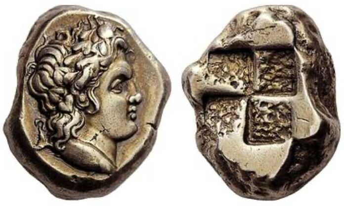 Мизия, статер (Электрум, 16,10 г), ок. 380 г. до н. э. Аверс: Голова молодого Пана вправо, в венке из плюща и с козьим ухом; под усечением тунец вправо. РЕВЕРС: Четырехчастный вдавленный квадрат. ССЫЛКА: Jameson 1418a. SNG Paris 331. Von Fritze 192.