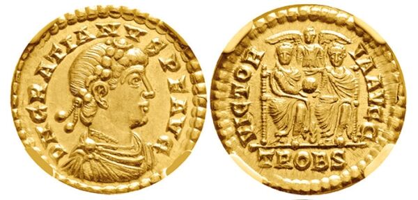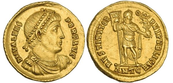 Валентинианская династия придерживалась схожей нумизматической идеологии, и многие из них чеканили монеты с почти идентичными портретами, как можно увидеть ниже. Хотя этот стиль появился раньше в династии Константина, тип бисерной диадемы вышел на передний план с валентинианской римской чеканкой монет. Например, портреты Валента и его зятя Феодосия I на этих золотых солидах носят очень похожие императорские регалии и имеют схожие физические черты.