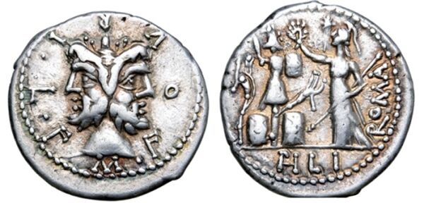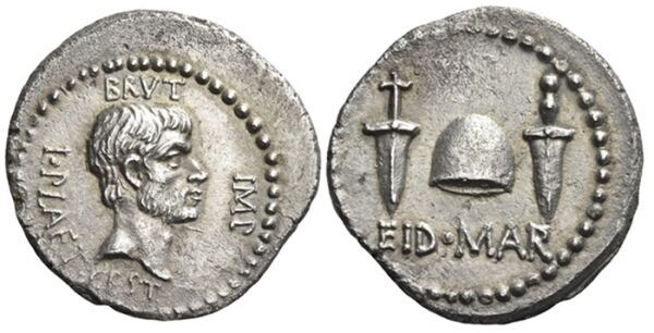 Возможно, самая известная портретная монета времен триумвиратов — это денарий Eid Mar (мартовских ид), на котором изображен относительно реалистичный портрет Марка Юния Брута , одного из убийц Цезаря. Он находится на аверсе, а на реверсе — шапка Диоскуров, олицетворяющая свободу, помещенная между парными кинжалами с надписью «Eid Mar» внизу — явная отсылка к убийству.