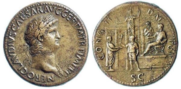Аналогично, монета Клавдия изображает императора Клавдия на аверсе и молодого Нерона на реверсе. Обе монеты используют идеализированные портреты юлиев-клавдиев. На момент чеканки Нерону было всего 14 лет, так что он действительно был ребенком, как предполагает этот портрет. Этот пример соответствует первому из четырех типов, в которые историки и нумизматы группируют портреты Нерона. Первый тип определяется «шлемом» из волос и чрезвычайной юностью будущего императора.