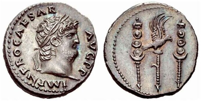 Переходя к чеканке Нерона, мы видим интересный экземпляр, который отсылает нас к более ранней монете, отчеканенной Августом в 13 г. до н. э. в честь Агриппы , «друга детства, помощника и будущего избранного наследника» Августа перед его смертью в 12 г. до н. э. На аверсе денария Августа изображен Август, а на реверсе – Агриппа в качестве Цезаря.