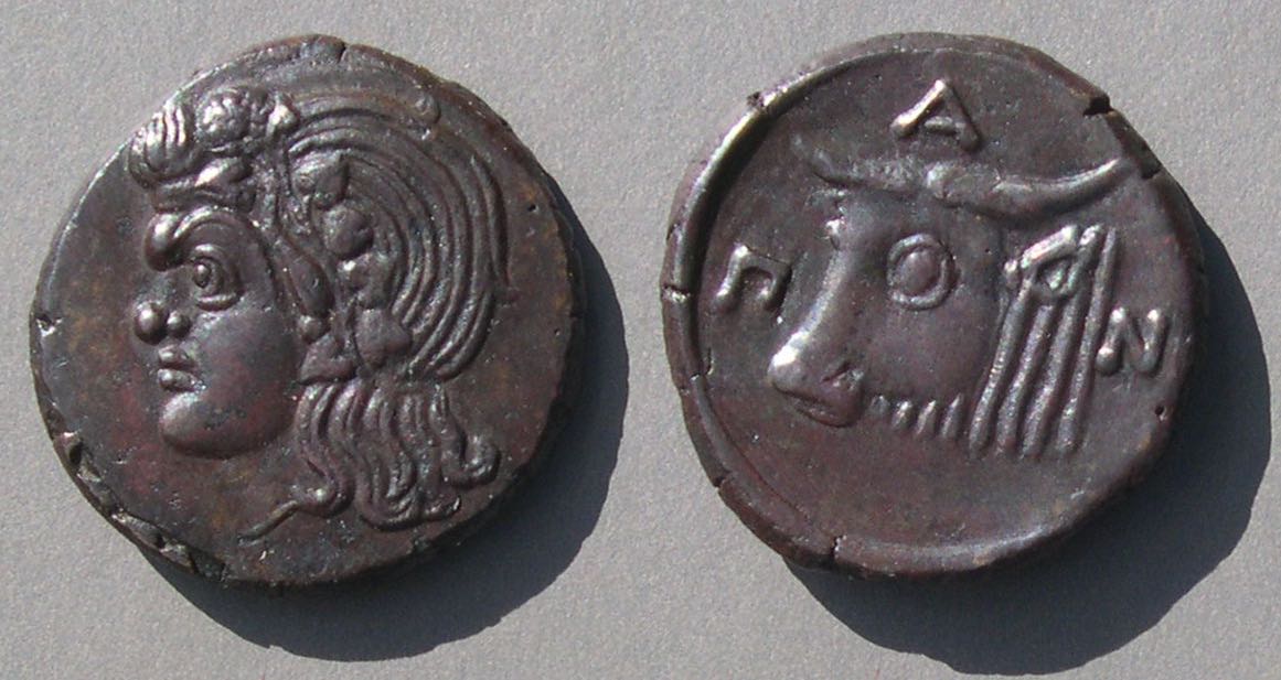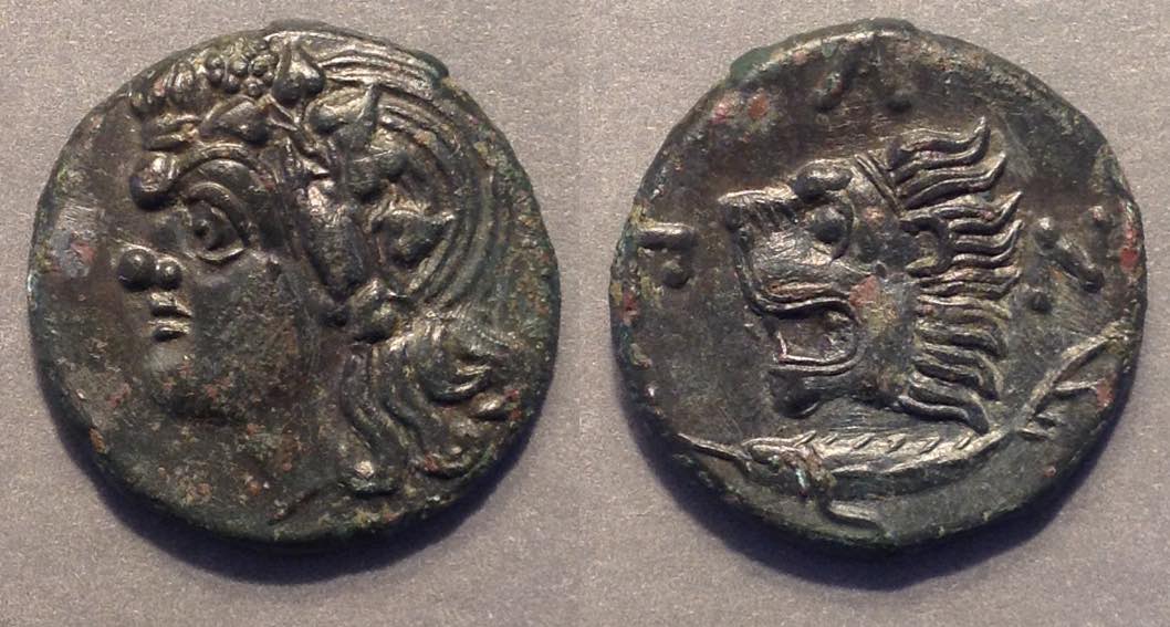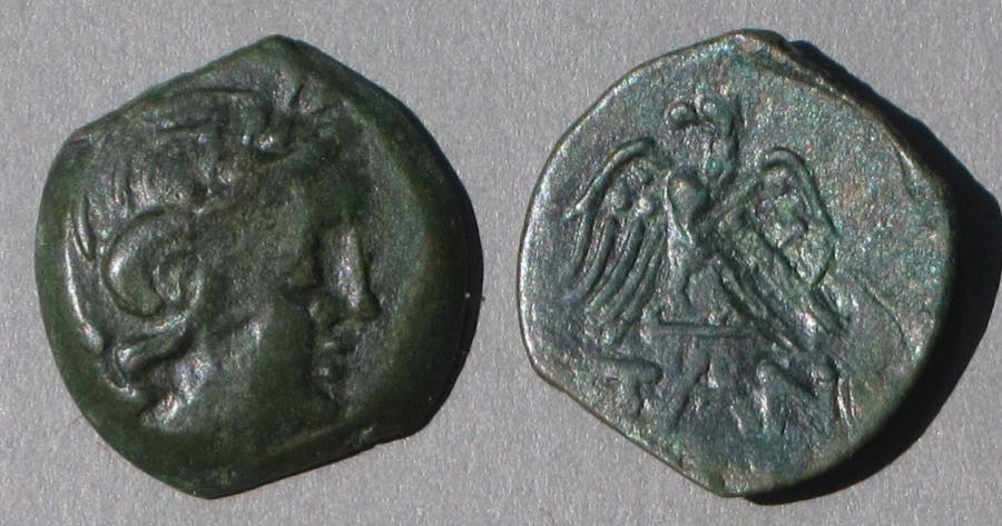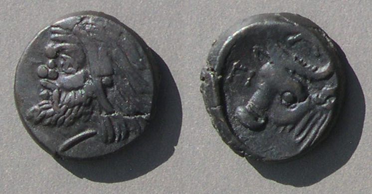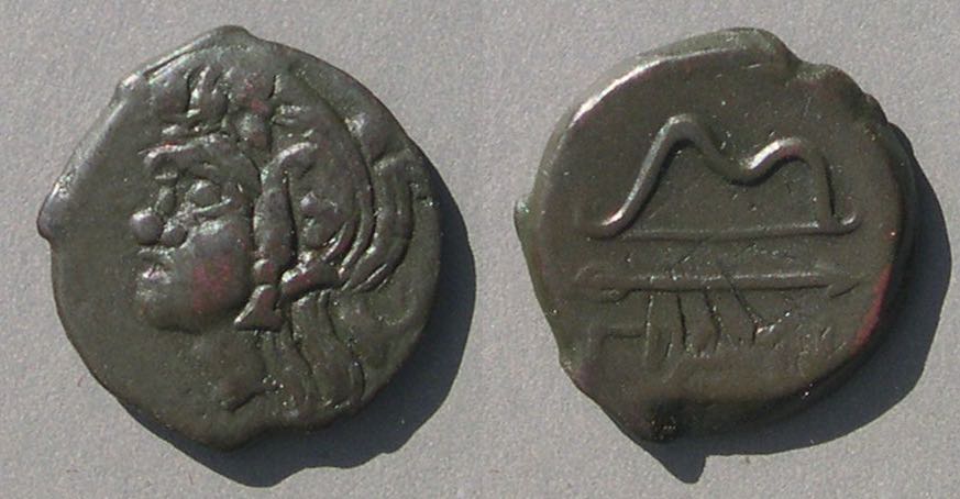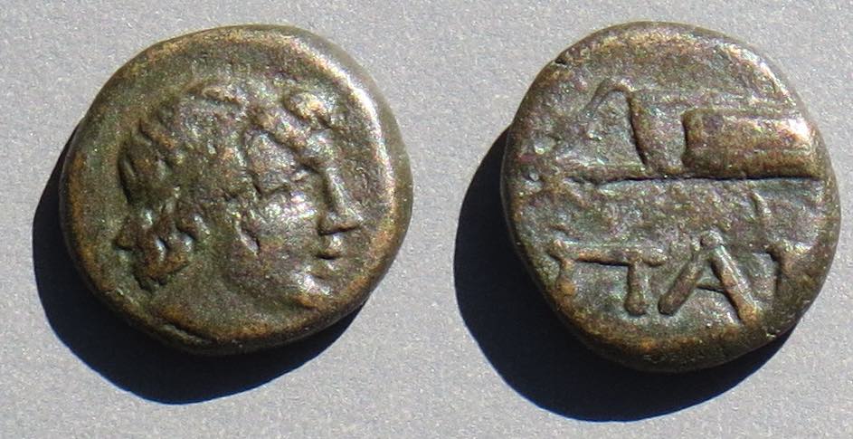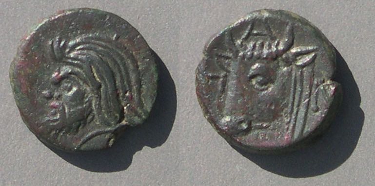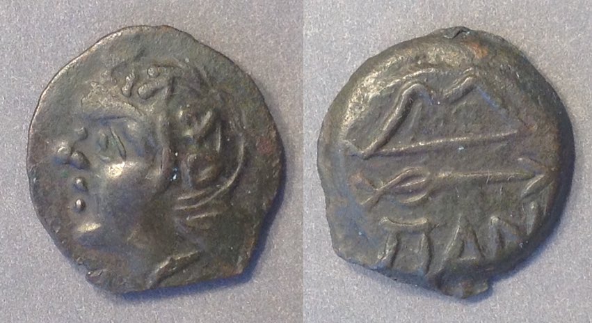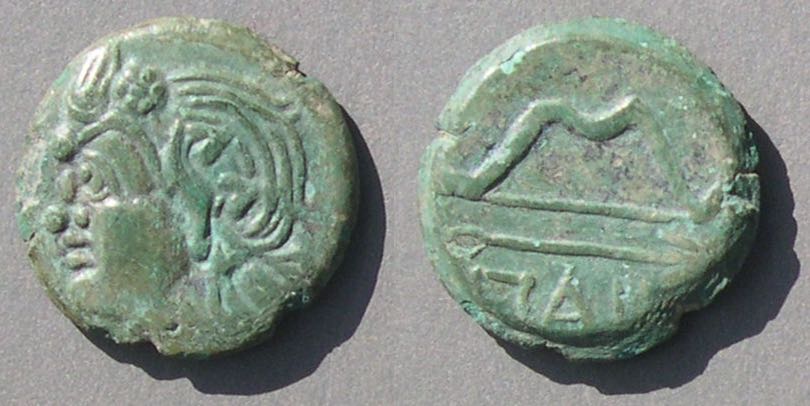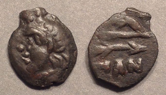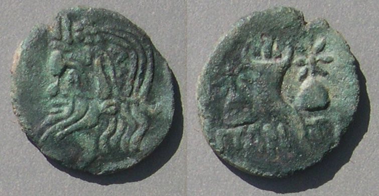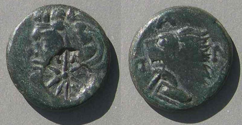Эта монета того же дизайна, что и выше, но меньшего размера, датируется (приблизительно) 150-140 гг. до н.э.
