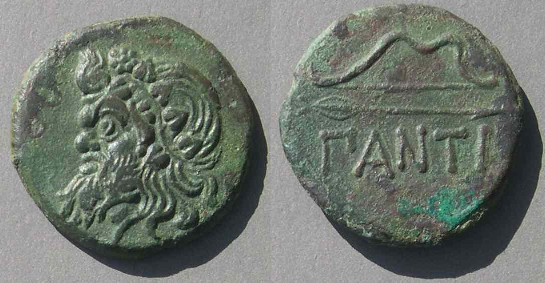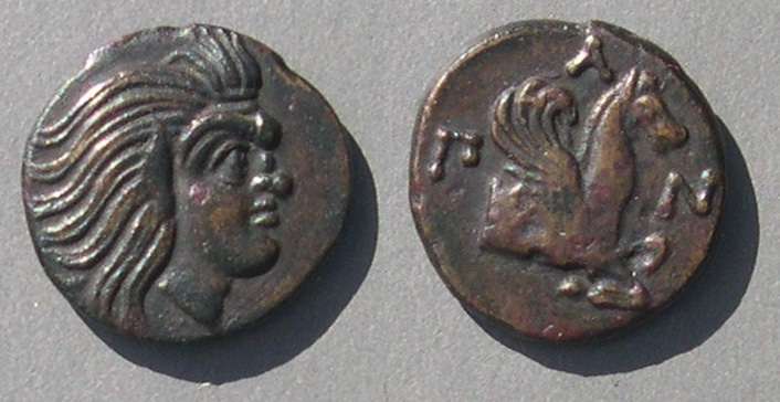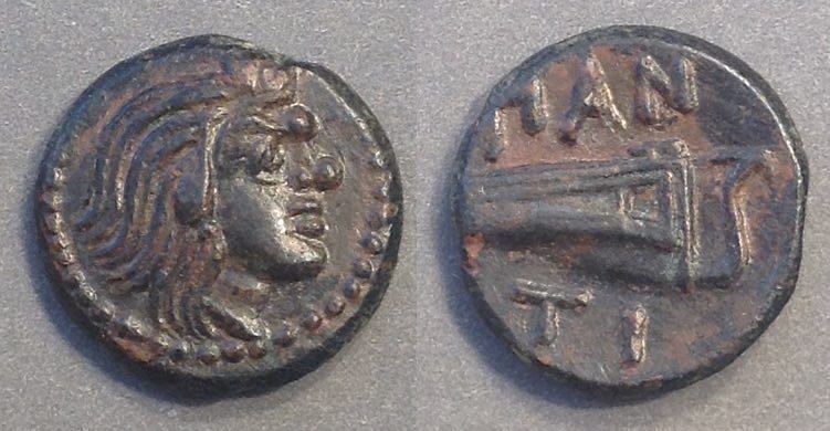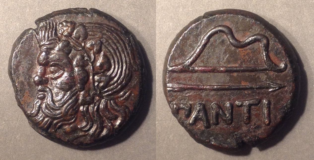 В VI-II вв. до н. э. Пантикапей был греческим городом-государством, выпускавшим высокохудожественные монеты с изображением Пана на аверсе и названием города «ΠANTI» или «ΠAN» на реверсе.