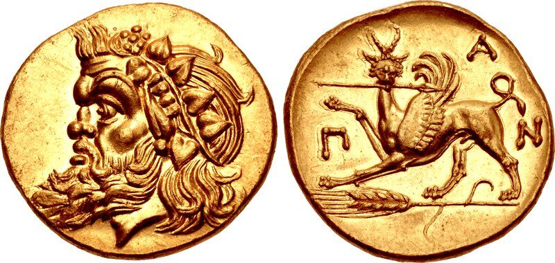 Пантикапей начал чеканить в середине IV в. до н. э. Прекрасные золотые монеты включали вс себя статеры и дробные номиналы полустатеры (4,55 г) и 1/6 статера (1,51 г). Первоначально они чеканились по боспорскому стандарту в девять граммов в статере, но к концу века монетный двор перешел на аттический стандарт в 8,5 грамма. Ниже показан пример золотого статера боспорского стандарта. На аверсе изображена голова Пана (каламбур на название города), а на реверсе — грифон, который, как считалось, охранял источники золота в скифских землях. Под грифоном изображен колос, что отсылает к торговле зерном. ПАН — греческое слово, первые три буквы названия города и бога. Портреты могли принадлежать правителям Спартокидам. Золотые статеры двух стандартов по сути идентичны.