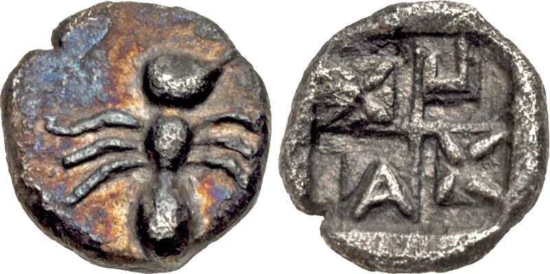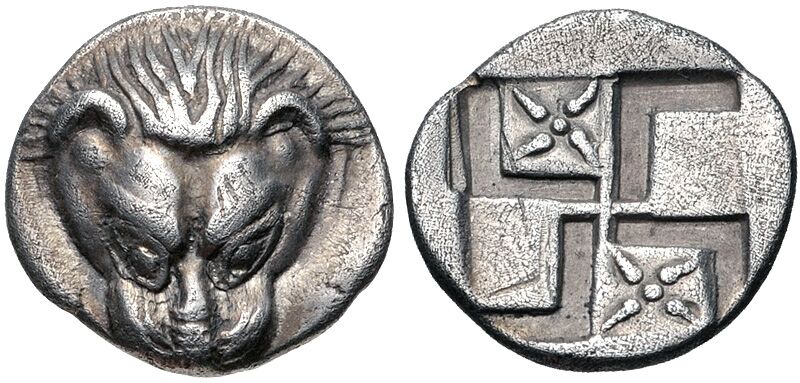 Чеканка серебряных монет началась в пятом веке и продолжалась до первого века. Эти монеты были отчеканены по персидскому стандарту 5,55 к сиглосу драхмы, также называемому уменьшенным эгинетским стандартом. Типичная серебряная монета этого периода имела голову льва на аверсе и вдавленный пуансон на реверсе. Лев взят с милетских монет, а вдавленный рисунок мог включать свастику или звездчатый узор.