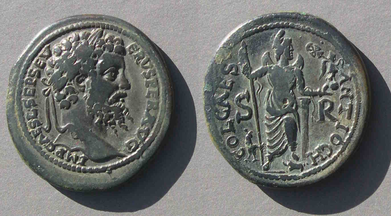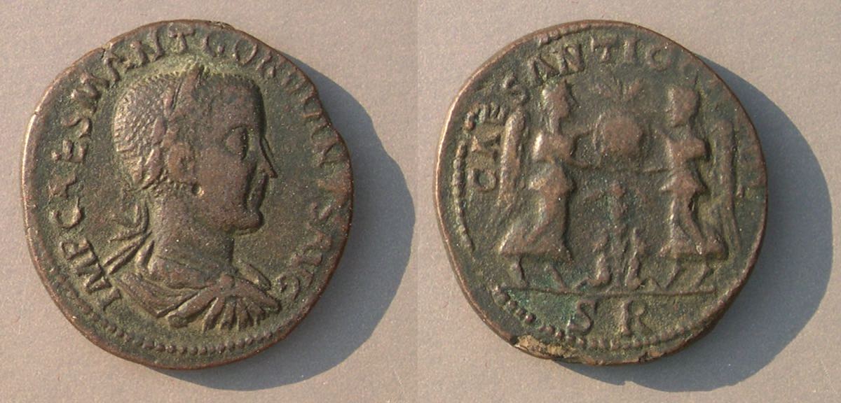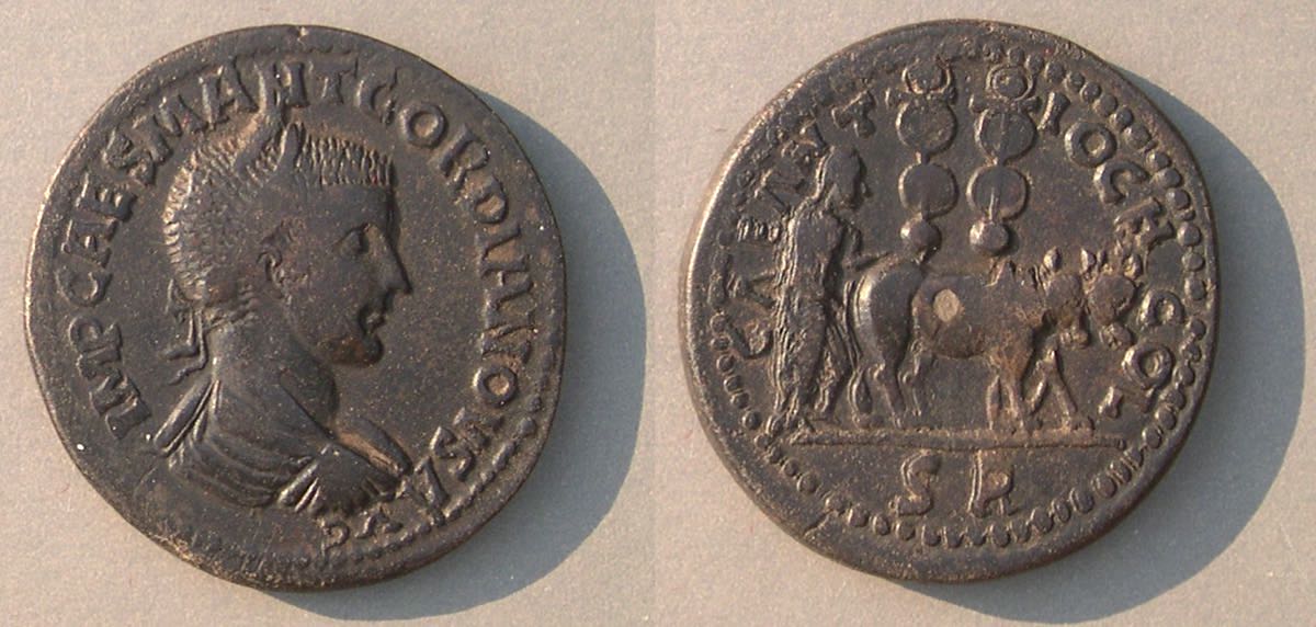 Город ввел этот большой номинал в 33 или 34 мм, в то время когда императорский сестерций был 31 мм или меньше. Мы не знаем его древнего названия и за неимением лучшего называем провинциальным сестерцием. Обширные выпуски при Гордиане III могут быть связаны с императорским благодеянием или его восточными войнами (т. е. мы не знаем, почему было выпущено так много крупных монет]. Монеты размером в сестерций приходят в упадок после Гордиана, и обычными становятся мелкие монеты диаметром около 20 мм.