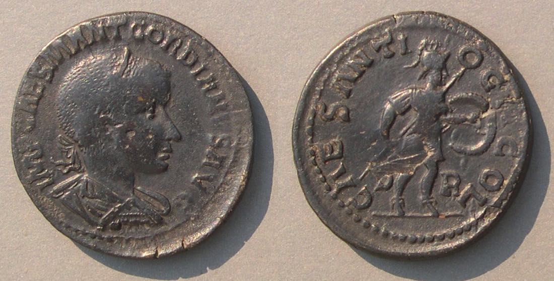 | Гордиан III едет вправо, пронзая врага копьем , VIRT AVG COL ANTIOCH | Л | 2714-2715 | 10, 9 |