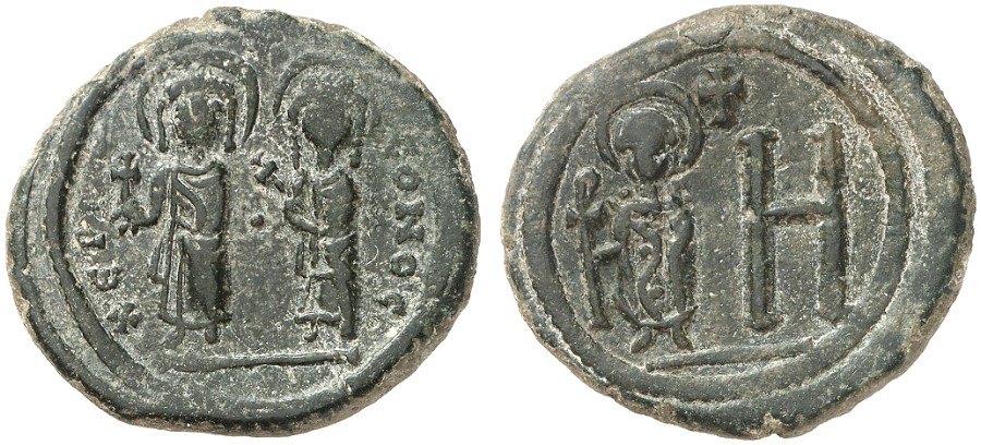 Отличительный тип «H»:   «H» по-гречески означает «8». Монета номиналом 40 нуммисов, маркирована как 8 пентануммий. 8×5 = 40. Фоллис. Большой. 33 мм. 14,69 грамма. Этот тип по-разному приписывался Юстину II и Софии (565-578 гг. н. э.) или Маврикию (602-610 гг.).