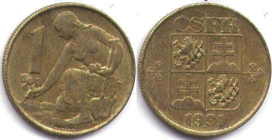 Чехословакия 1 крона 1991медно-никелевый сплав с цинком