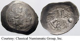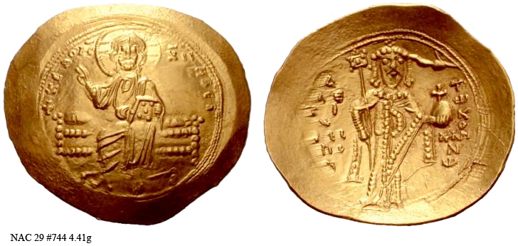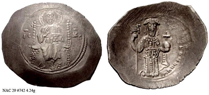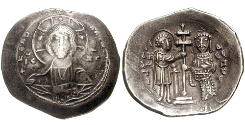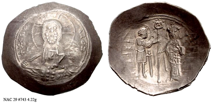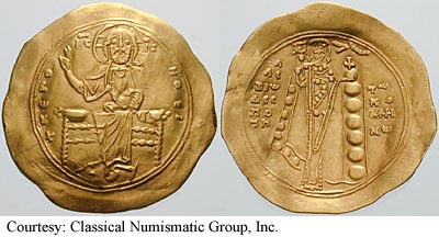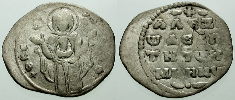 Реверс: A/LE/ZI/W/Р EC/PO/T TW/KO/MNH/N - Алексей стоит прямо, держит лабарум и имперскую державу; Божья рука сверху. 1092-1118 (Салоники).