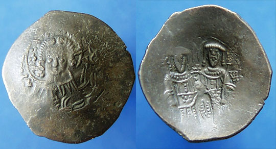 Реверс: AО›ЄОЈIWО”ЄCО О?KWN'TANTI - Алексей и св. Constantine стоит прямо, держит флаг между ними, каждый держит крестообразный скипетр. (Константинополь).