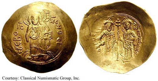 Аверс: +KЄROHОёЄI - Христос на троне, в драпировке, держит Евангелие слева и поднятую в благословении правую руку, по краям IC XC