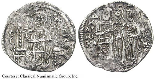 Реверс: ANDRONIKOCDEPO - Андроник коленопреклонён влево перед Христом стоит вправо; IC XC справа. 1341-1347 (Константинополь).