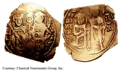 Реверс: О”HMHTPI GOA ANО”PONI - св. Димитрий слева, стоит прямо, держит крест, и Андроник III справа, стоит прямо, рука на груди. (Константинополь). $950 1/16/02.
