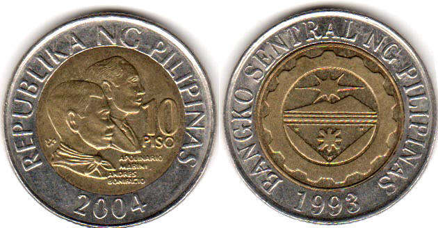 10 PISO / APOLINARIO MABINI / ANDRES BONIFACIO / REPUBLIKA NG PILIPINAS 2004 / Два совмещённых бюста вправо