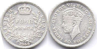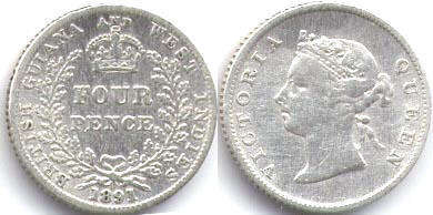 FOUR PENCE /BRITISH GUIANA AND WEST INDIES 1891 / Корона над номиналом внутри венка