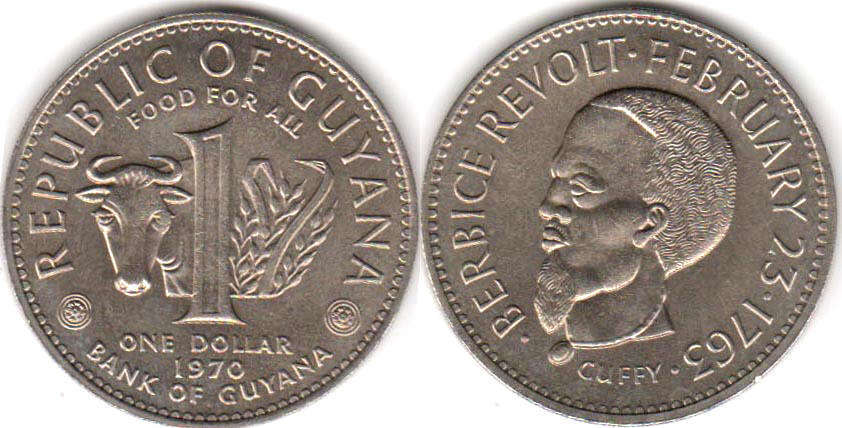 REPUBLIC OF GUYANA / FOOD FOR ALL / 1 ONE DOLLAR 1970 BANK OF GUYANA / Голова быка справа, колосья слева от номинала
