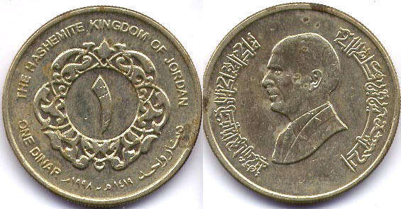 1 / ONE DINAR 1998 1418 / THE HASHEMITE KINGDOM OF JORDAN / Номинал в круге из растительного орнамента