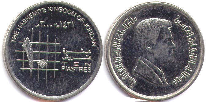 1 / ONE QIRSH / 1421-2000 / THE HASHEMITE KINGDOM OF JORDAN / Номинал на фоне сетки и надписью, дата сверху