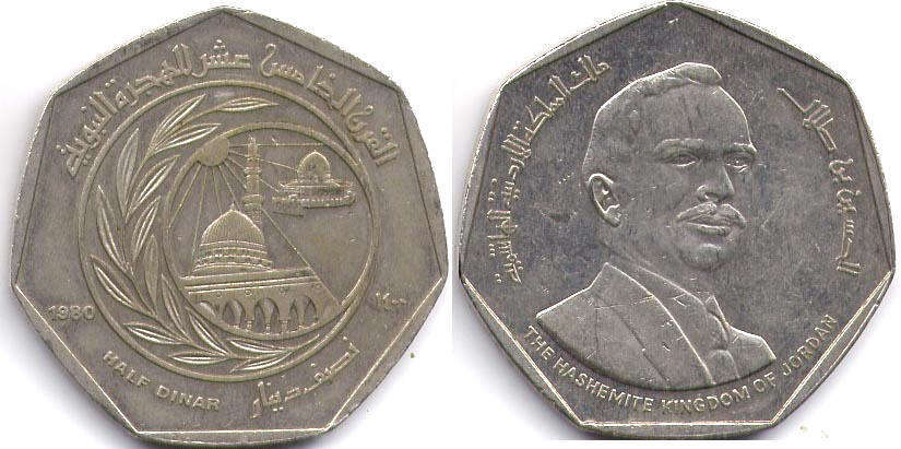 1/2 / HALF DINAR 1996 1416 / THE HASHEMITE KINGDOM OF JORDAN / Номинал в круге из растительного орнамента