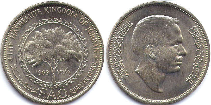 F.A.O. / QUARTER DINAR / 1969 1389 / THE HASHEMITE KINGDOM OF JORDAN / Оливковое дерево внутри кругового венка