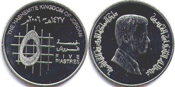 5 / FIVE PIASTRES / 2004-1425 / THE HASHEMITE KINGDOM OF JORDAN / Номинал на фоне сетки и надписью, дата сверху