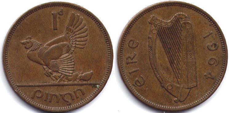 Ирландская Крона=5 шиллингов; Шиллинг=12 пенсов; Пенни=4 фартинга (1937-1968)