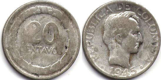 VEINTE CENTAVOS / G.5 BOGOTA LEI 0,666 / Государственный герб, номинал сверху
