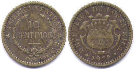 10 CENTIMOS / AMERICA CENTRAL / C.C.R / Номинал внутри венка