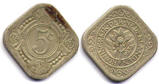 тип аналогичный Нидерландским 5 центам, но монета 1943 г. чеканилась исключительно для обращения в Кюрасао и Суринаме