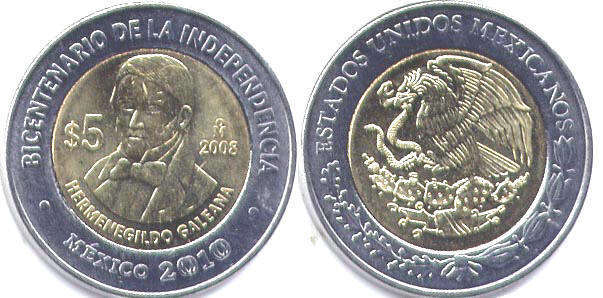BICENTENARIO DE LA INDEPEDENCIA / $5 2008 / HERMENEGILDO GALEANA / MEXICO 2010 / Бюст в 3/4