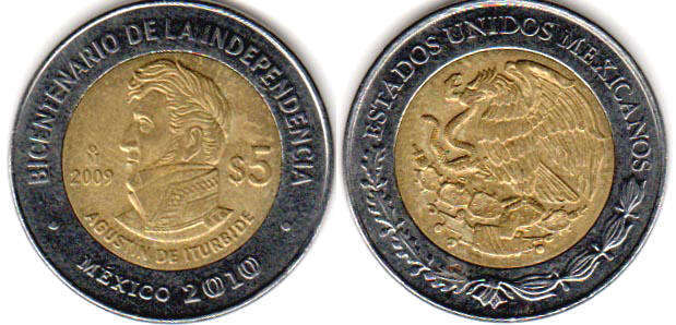 BICENTENARIO DE LA INDEPEDENCIA / $5 2009 / AUGUSTIN DE ITURBIDE / MEXICO 2010 / Бюст влево