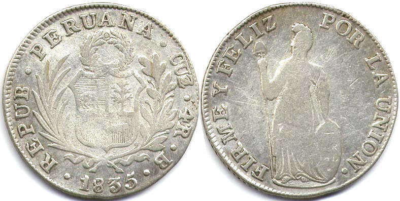 REPUB PERUANA CUZ 4R 1835 / Венок над гербом, колосья снизу