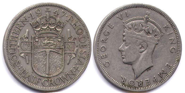 G VI R I / HALF CROWN / SOUTHERN 1947 RHODESIA / Коронованный герб