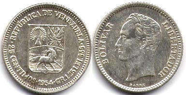 REPUBLICA DE VENEZUELA / 25 CENTIMOS 1954 GR.1.25 LEI 835