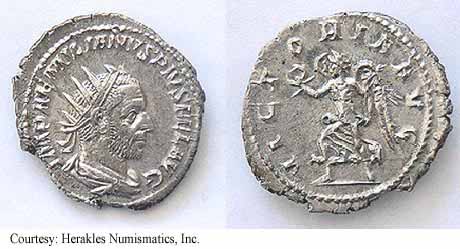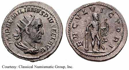 Реверс: ERCVLVICTORI - Геркулес стоит вправо, опирается рукой на дубинку и держит лук и львиную шкуру. [RIC легенда аверса IMP AEMILIANVS PIVS FEL AVG]. 253 (Рим).