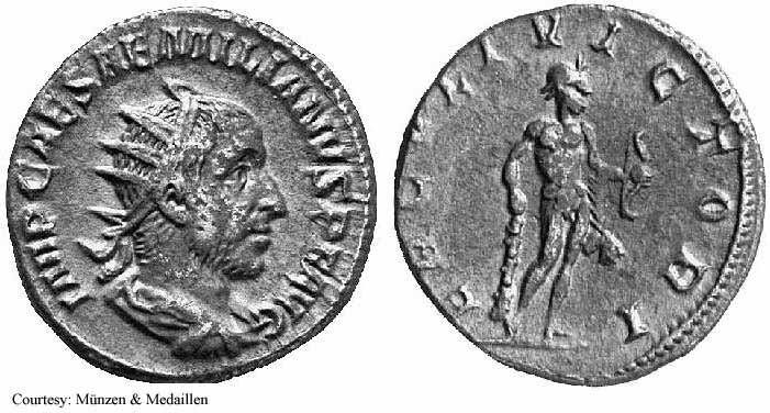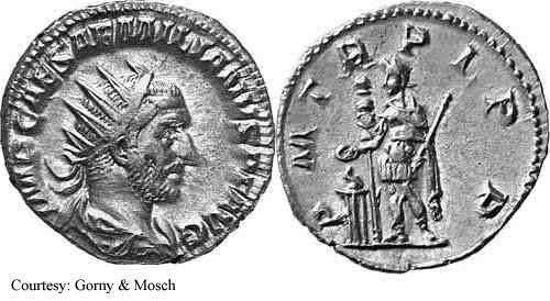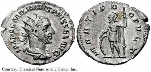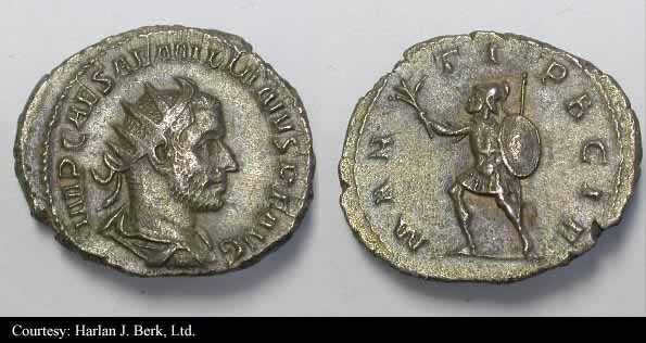 Реверс: PMTRPIPP - Эмилиан стоит влево, приносит жертву над алтарём и держит скипетр; штандарт влево. 253 (Рим). $500 1/17/02.