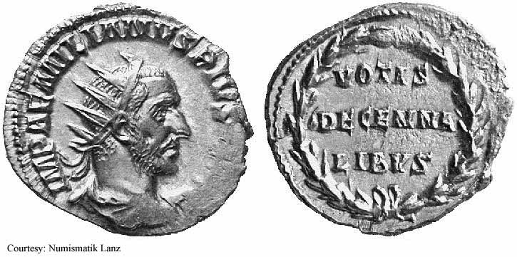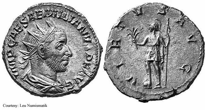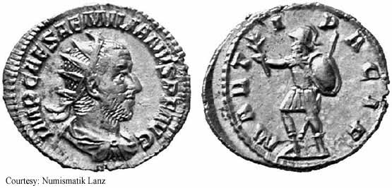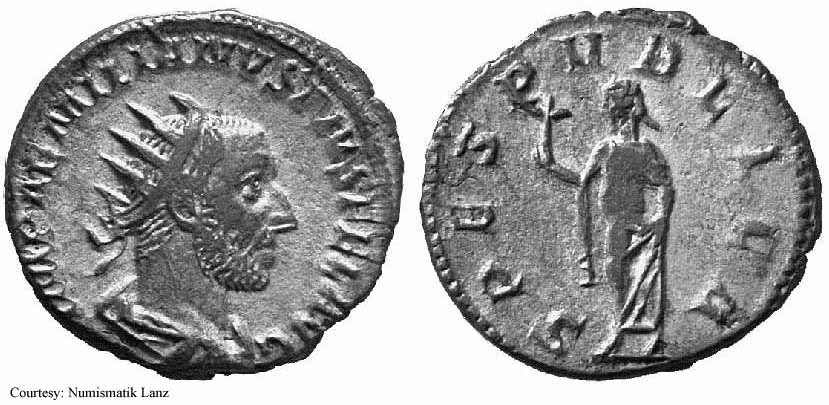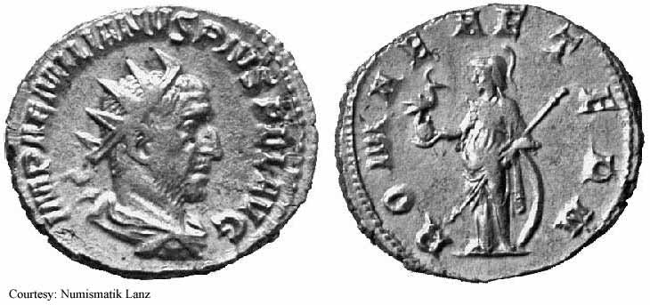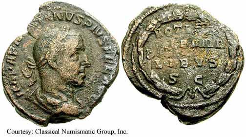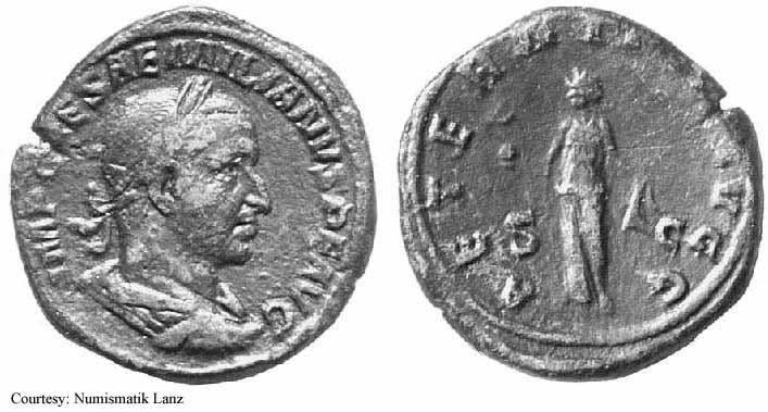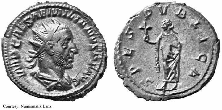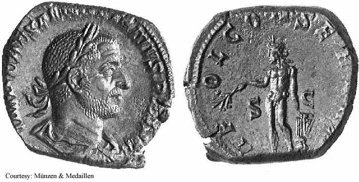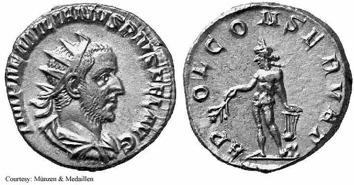 Реверс: APOLCONSERVAT - Апполон стоит влево, держит ветвь и опираясь рукой на лиру; SC на полях. 253 (Рим).