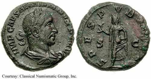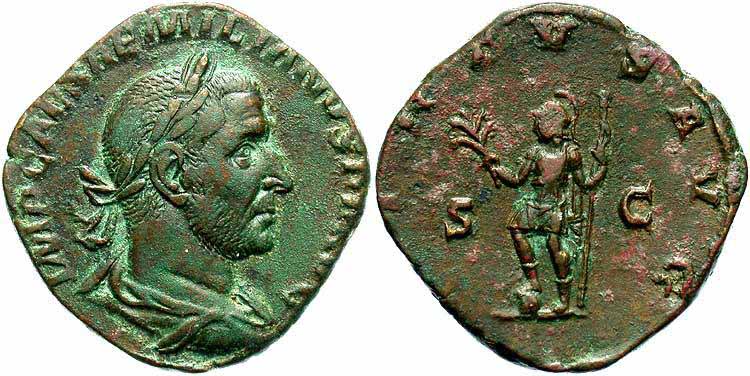 Реверс: VIRTVSAVG - Виртус стоит влево, держит ветвь и держит скипетр; SC на полях. 253 (Рим).