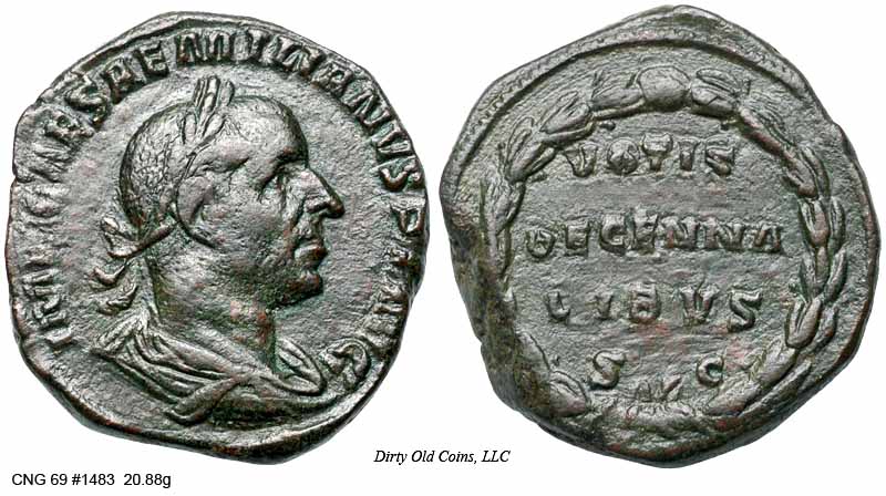 Аверс: IMPCAESAEMILIANVSPFAVG - В лавровом венке, в драпировке бюст вправо.