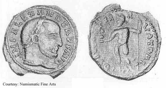 Реверс: GLORIAEXERCITVSKART Монетный двор: ЄK - Александр верхом на лошади вправо. (Карфаген).