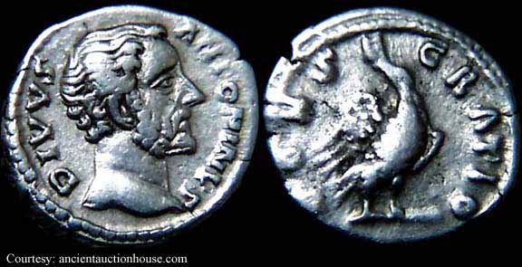 Реверс: CONSECRATIO - Орёл стоит вправо на глобусе, голова влево. 162 (Рим).