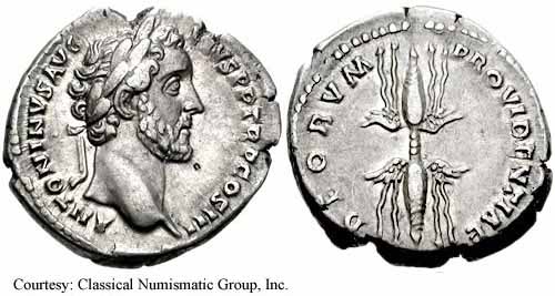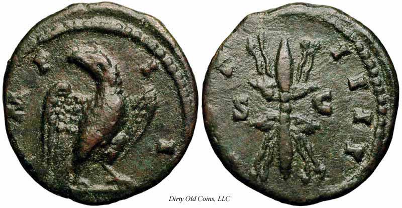 Реверс: COSIIII - Крылатая молния; S C на полях. [РИК известна монета с легендой IMPERATOR II; также RIC 739, который аналогичен этой монете, за исключением версии легенды COS III].