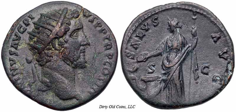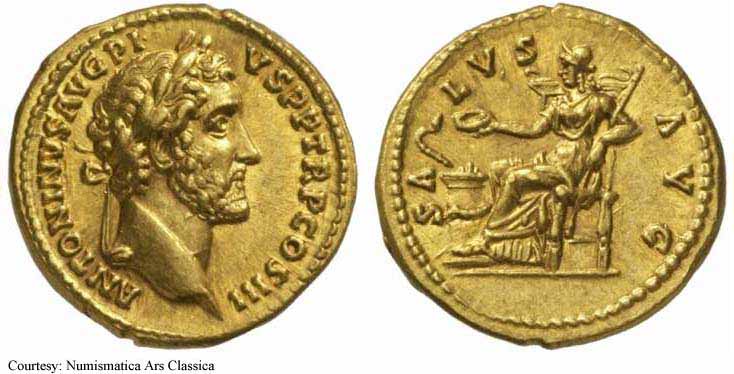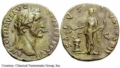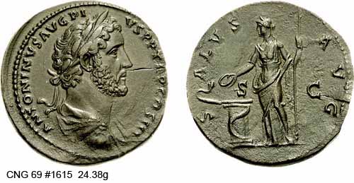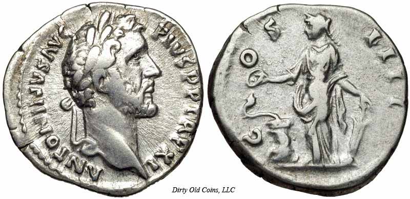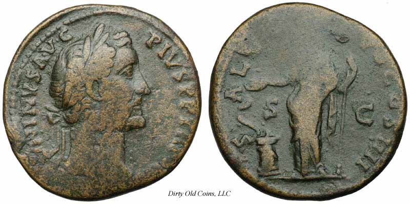 Реверс: SALVSAVG - Салюс сидит влево, кормит змею из патеры; змея обвилась вокруг алтаря и держит скипетр. [RIC, Cohen описывают без скипетра]. Около 140-144 (Рим). $4, 753 12/5/02.