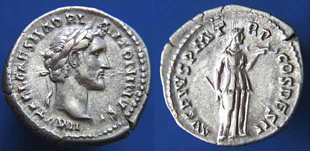 Реверс: TRPOTCOSIIII - Минерва стоит влево, держит Викторию и копьё со щитом. Около 145-161 (Рим).