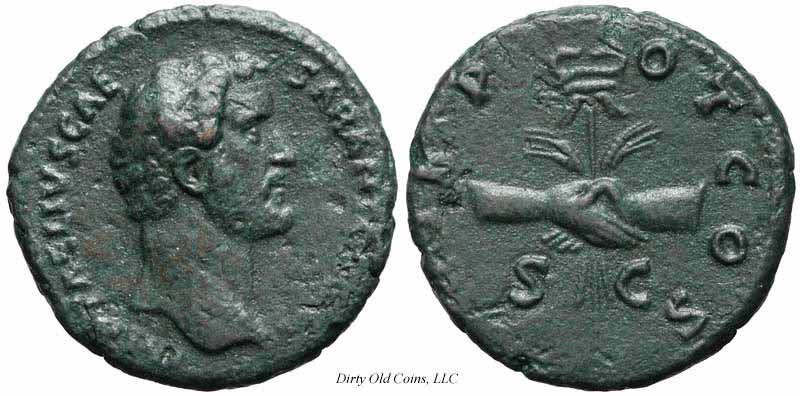 Реверс: TRIBPOTCOS - Руки в рукопожатии, держит крылатый кадуцей и зерновые колосья. Февраль - Июль 138 (Рим).