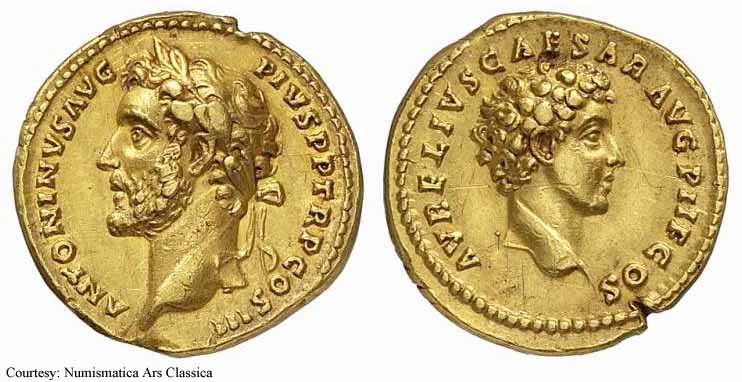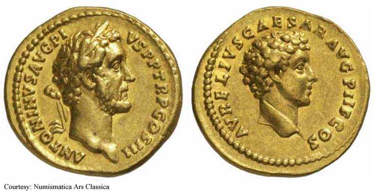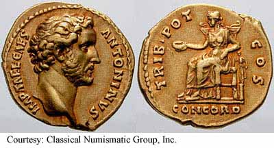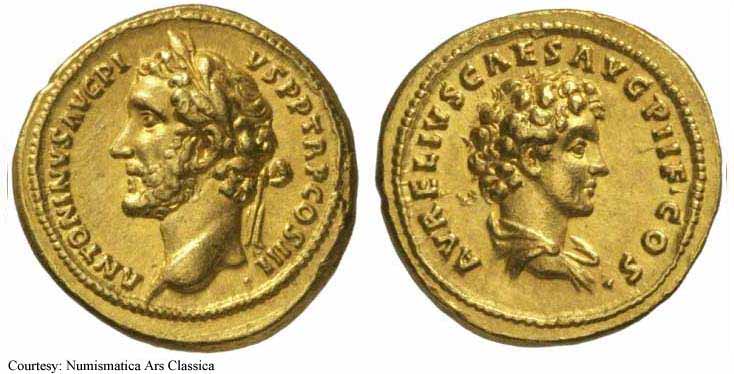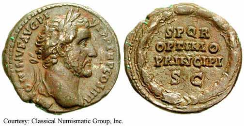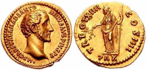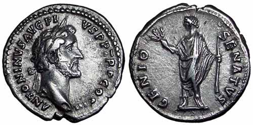 138 - 161. Антонин сменил Адриана после смерти последнего и получил дополнение «Пий» после одобрения прокламации Сената об обожествлении Адриана. Благодаря сочетанию удачи и уравновешенного и бережливого характера он смог осуществить самое образцовое и мирное правление из всех императоров до или после. Его больше интересовала модернизация римского права и его инфраструктуры, чем ведение завоевательных войн. После смерти он был тоже обожествлён, а империя вновь погрузилась в смутные времена.