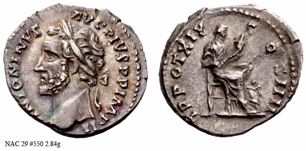 Аверс: ANTONINVSAVGPIVSPPTRPXVII - Голова в лавровом венке влево.