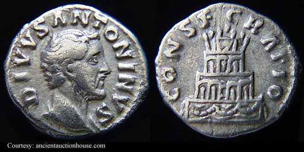 Реверс: CONSECRATIO - Погребальный костер. 161 (Рим).