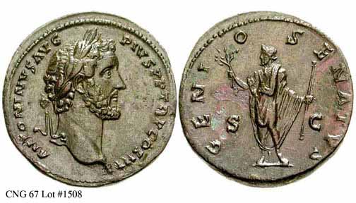Аверс: ANTONINVSAVGPIVSPPIMPII - Голова в лавровом венке вправо.